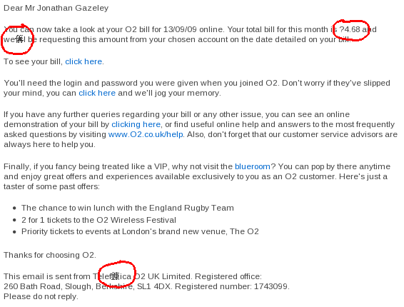 More O2 brokenness Posted byJonathanSep 13, 2009Posted inMiscTags:broken, characters, email, invalid, O2 I just received my phone bill from O2 by email. See if you can spot the deliberate mistakes. Click for a bigger version. O2 phone bill Share this: Click to share on X (Opens in new window) X Click to share on Facebook (Opens in new window) Facebook Like Loading... Related
