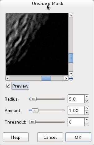 Scroll around in the preview window to look at interesting parts of the image. Repeatedly tick and untick the Preview box so you can see what effect the unsharp mask will have. When you’re happy, press OK.