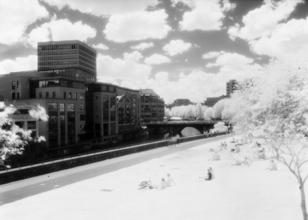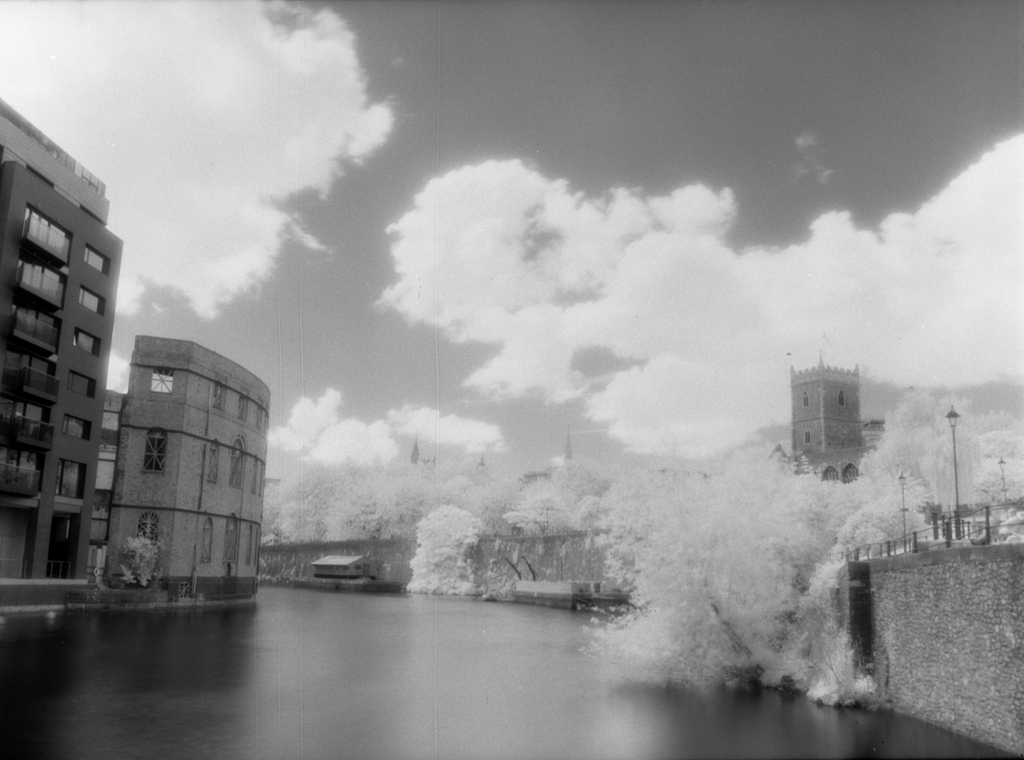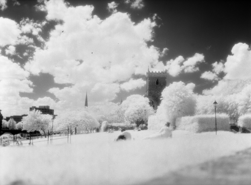 Getting the exposure right with infrared photography is notoriously hard. Last time I tried infrared, back in Spring, I made a roll of widely bracketed shots and compared them to meter readings of visible light. I calculated that whatever the meter said, I needed to add 9 stops[1]. Having come up with this value I then shot a roll of film using this method, no bracketing – and it worked a treat.