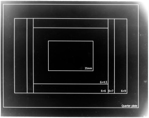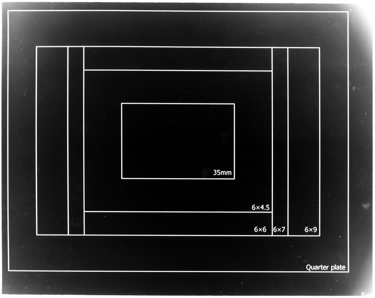 I decided to test the coverage of my enlarger lenses by using a piece of acetate transparency and printing on the frame sizes of various film formats up to 5×4″. I used a standard office laser printer to print the diagram below onto transparency. You can download and print your own test negative, but be aware this is sized for A4 paper so be careful if you’re printing onto other formats such as US letter. Check it with a ruler after printing no matter what paper size you’re using, as some printers do “magic” things with resizing.