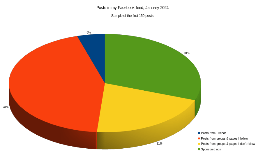 It seems my gut feeling was correct! About a fifth of my feed consists of items from pages and groups I don’t follow, and a third is sponsored ads. In total, a little over half my feed is content that I didn’t ask for!