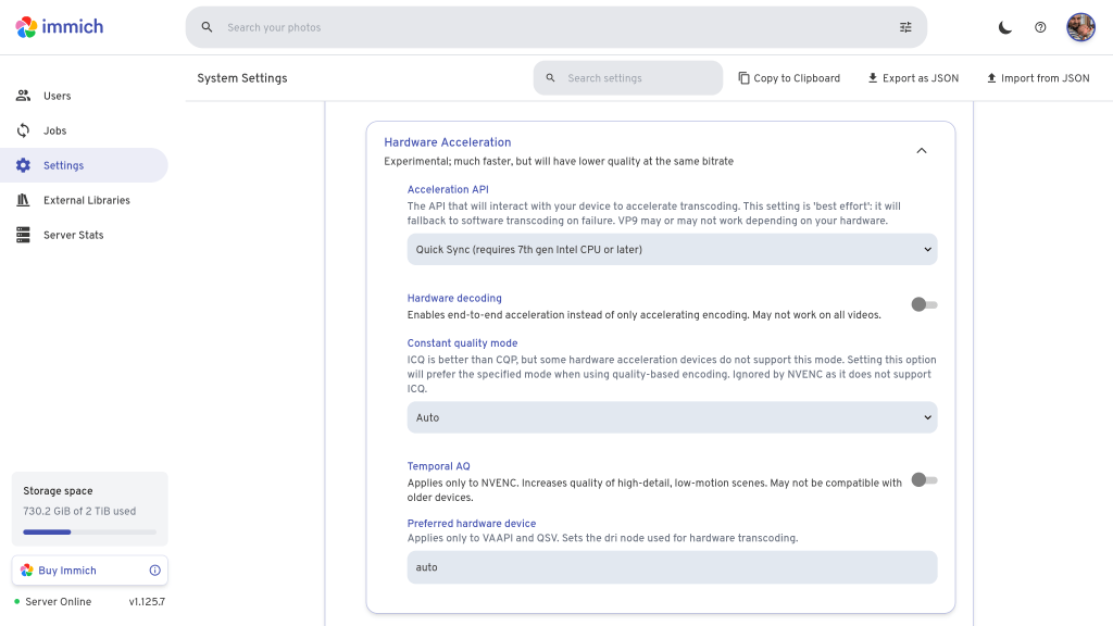 As with Jellyfin, we need to actually configure hardware acceleration in the Immich GUI. Click your user avatar, go to Administration, Settings, scroll down to Video Transcoding Settings, and go to Hardware Acceleration. Once again, we have the choice of QSV or VA-API, and I have chosen QSV.