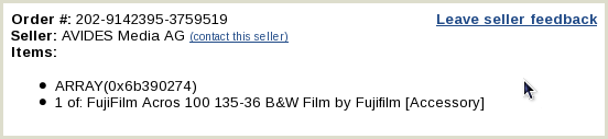 And hot off the press, another fail entry. I placed an order with Amazon, and received this confirmation email. I sure don’t remember ordering an ARRAY(0x6b390274), but hey, if it’s free…