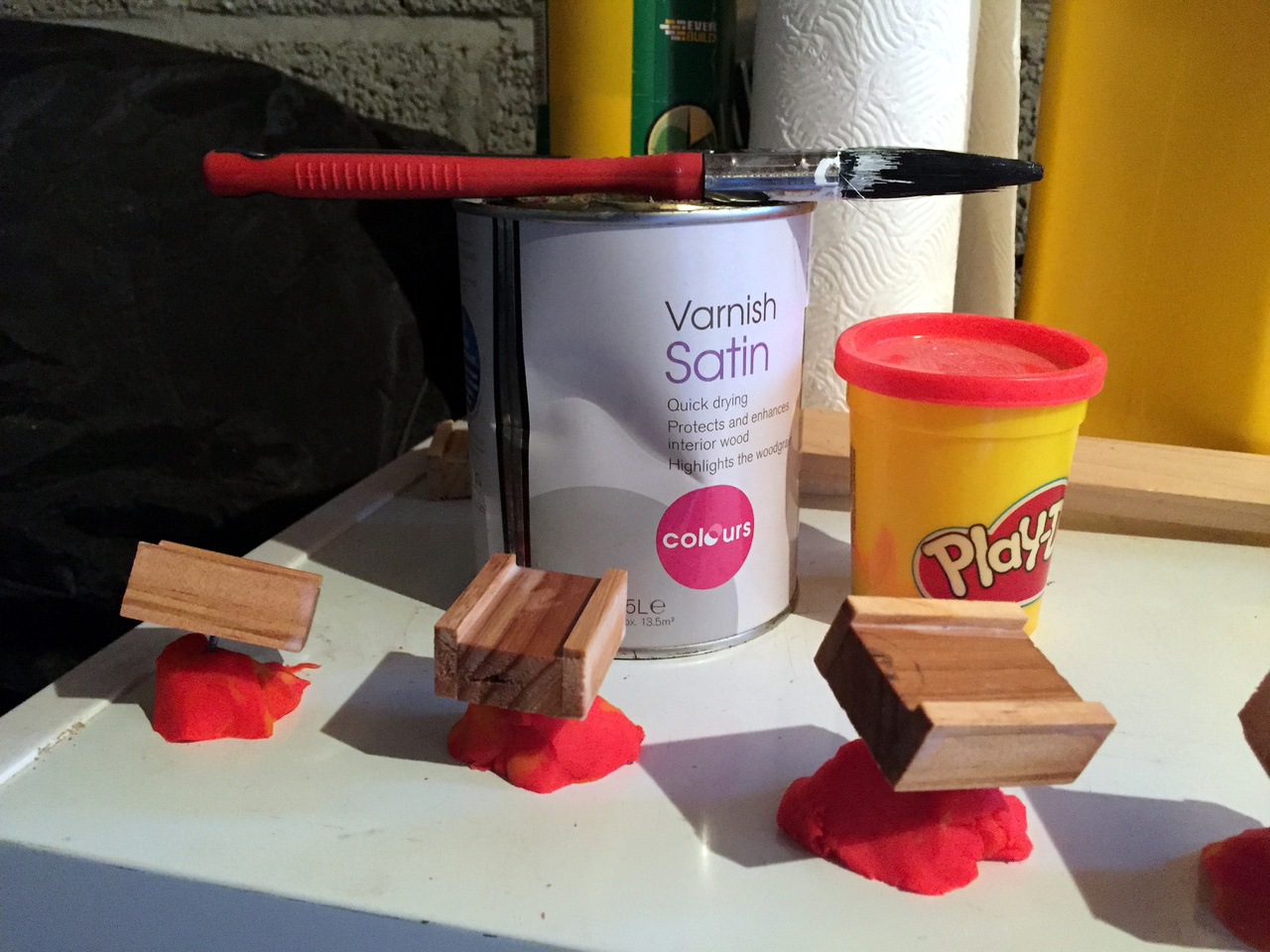 This is my trick to make varnishing easy – tap a small pin into the underside of each piece that you can use to hold the piece and paint all sides, and then stick in some Play-Doh to dry!