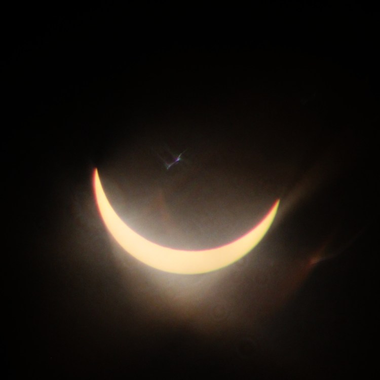 This is the closest to totality that we saw in Bristol during the solar eclipse this morning. Taken on a digital camera, but using a decidedly vintage Tokina RMC 400mm f/5.6 lens with Paragon 2x teleconverter and a custom-made solar filter.