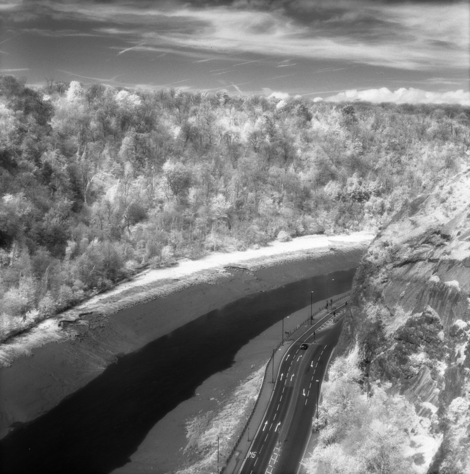 Part six of Infrared Week. This is a view down into the Avon Gorge, seen from the Clifton Suspension Bridge. The use of infrared film makes the water turn an eerie black while trees glow a pale white. Mamiya C220 camera with Mamiya-Sekor 80mm f/2.8 lens and Efke IR820 Aura film.