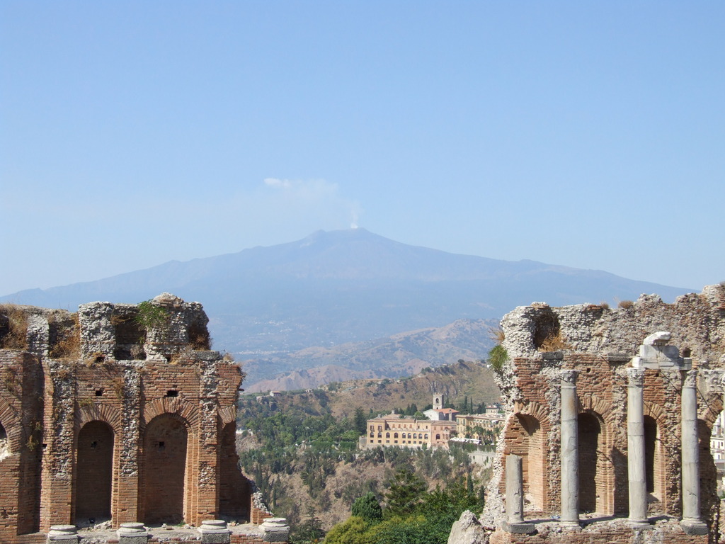 The Ancient Greeks built a theatre in Taormina, Sicily. Part of the back wall is now ruined, revealing this view of Mount Etna.